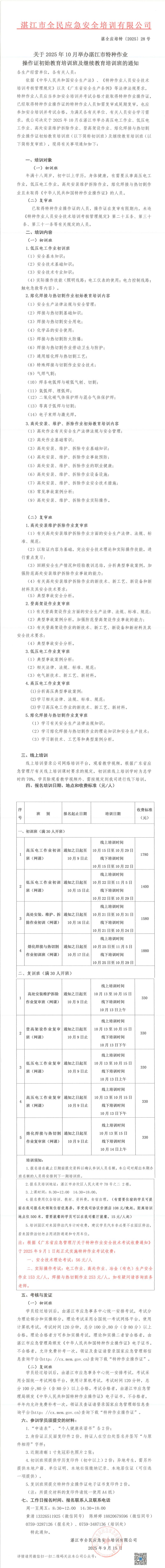 2025年10月高低壓電工作業(yè)、高處安裝維護(hù)拆除作業(yè)、登高架設(shè)作業(yè)、熔化焊接與熱切割作業(yè)初始教育培訓(xùn)班及繼續(xù)教育培訓(xùn)班的通知