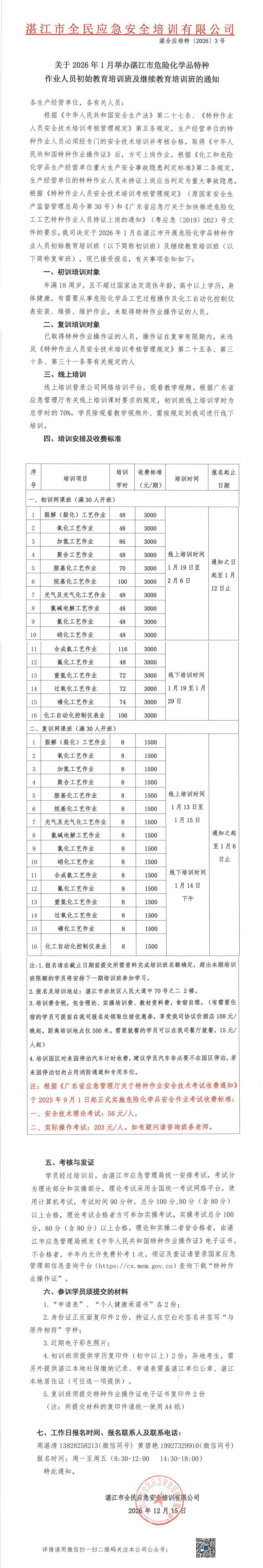 關(guān)于舉辦2026年1月份湛江市危險化學(xué)品特種作業(yè)初訓(xùn)培訓(xùn)班的通知